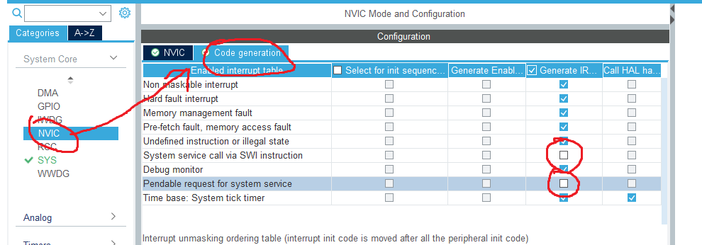 进入CubeMX,选择左侧System Core -> NVIC,然后选择中间页面左上角的Code Generator,并取消system service call via SWI instruction选项和pendable request for system service选项的复选框勾选(也就是不让CubeMX生成默认的中断处理函数)。