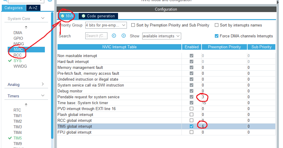 然后回到NVIC界面调中断优先级,数值上大于configMAX_SYSCALL_INTERRUPT_PRIORITY的值。