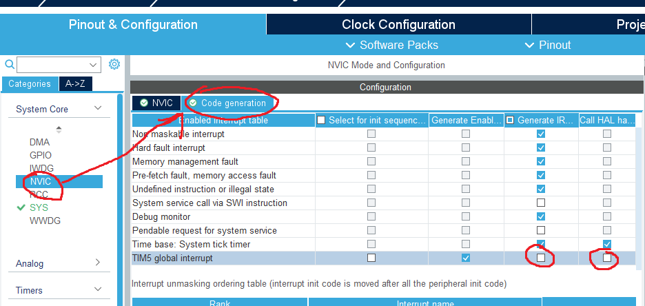 回到CubeMX的NVIC界面,进入Code Generator页面取消勾选刚刚你选择的定时器(本例为TIM5)的右侧的两个勾(即不生成中断处理函数,也不调用HAL函数)。